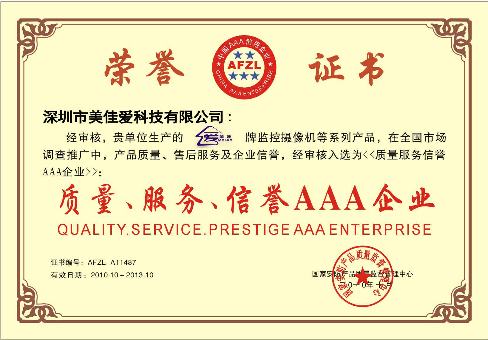 質量、服務、信譽AAA企業證書副本